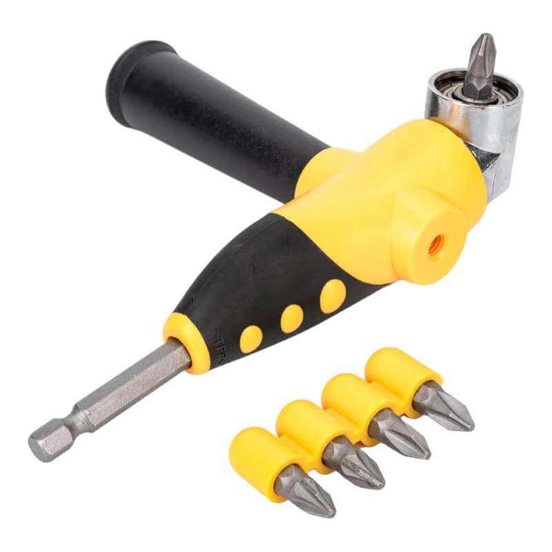 .Адаптор угловой металлический прорезиненный 45 градусов FIT применяется совместно с дрелями и шуруповертами. Используется для работы с битами. Адаптер делает проще работу в местах с затрудненным доступом. Корпус изготовлен из инструментальной стали, покрытие — из ударопрочного пластика. В комплекте поставляются 4 биты PH2, PH2, PZ2, PZ2.