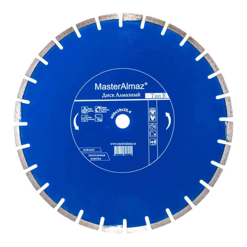 Диск алмазный сплошной по асфальту и плитке standard Тип В (400х10х25.4 мм) МастерАлмаз 10501446 предназначен для средних объемов работ и нагрузок. Используется для резки асфальта и тротуарной плитки. При работе необходимо охлаждение водой.
