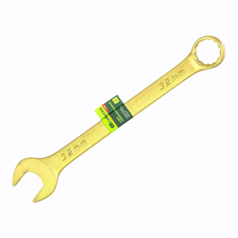 Ключ комбинированный, 32 мм, желтый цинк// Сибртех выполнен из углеродистой стали 45 и закален до твердости 42 HRC. Покрытие из желтого цинка защищает инструмент от коррозии. Накидная 12-гранная часть расположена к оси под углом 15°, благодаря чему повышается эффективность работы в труднодоступных местах.
