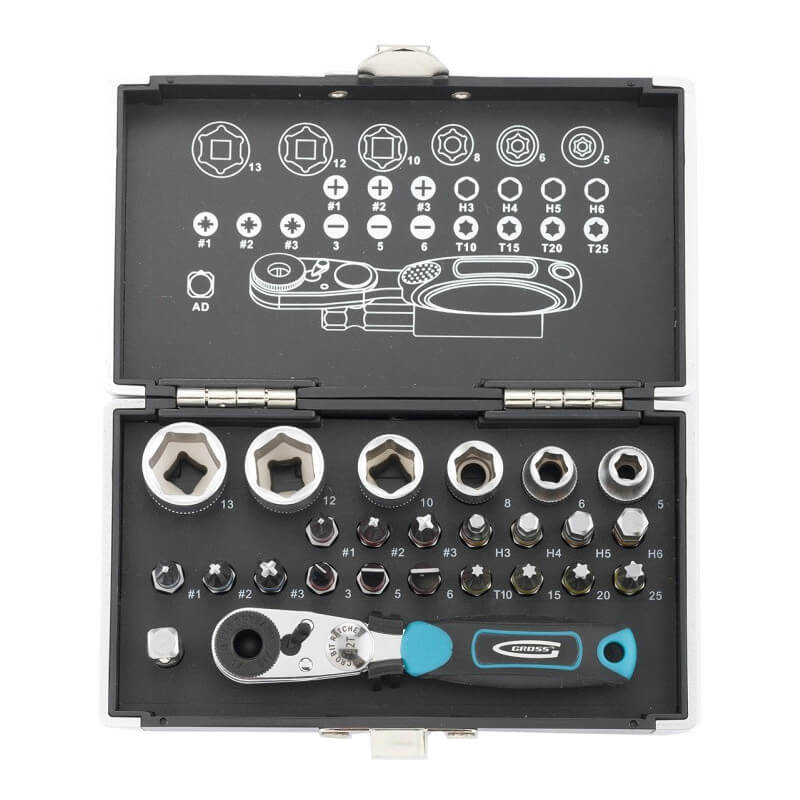 Набор бит и головок торцевых, 1/4, магнитный адаптер, сталь S2, пластиковый кейс, 26 предметов Gross