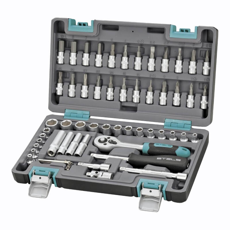 Набор инструментов, 1/4″, CrV, пластиковый кейс 57 предметов Stels предназначен для профессионального использования в автомастерской и решения бытовых задач. Набор содержит инструменты и насадки для работ с резьбовыми крепежами, удлинители, вороток, карданные шарниры. Размеры присоединительных квадратов — 1/4″, 3/8″ и 1/2″. Рабочие части инструментов изготовлены из хромованадиевой стали, биты произведены из японской стали S2.