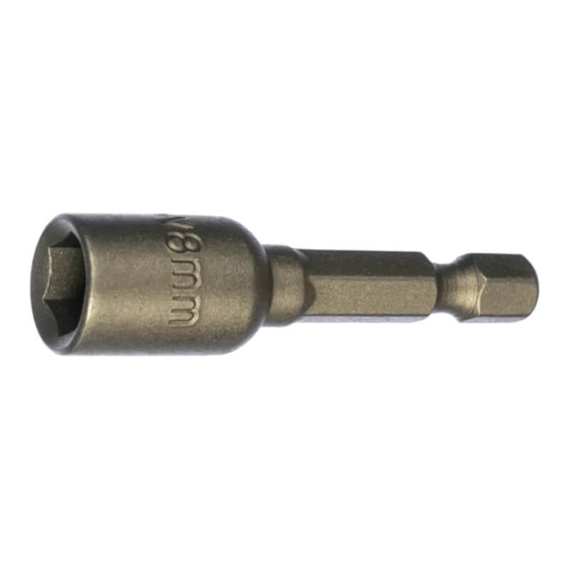 Диаметр головки — 8 мм. Хромованадиевый сплав позволяет оставаться корпусу насадки прочным, а шестигранный хвостовик — фиксировать насадку в патроне дрели или шуруповёрта. Длина биты 48 мм.