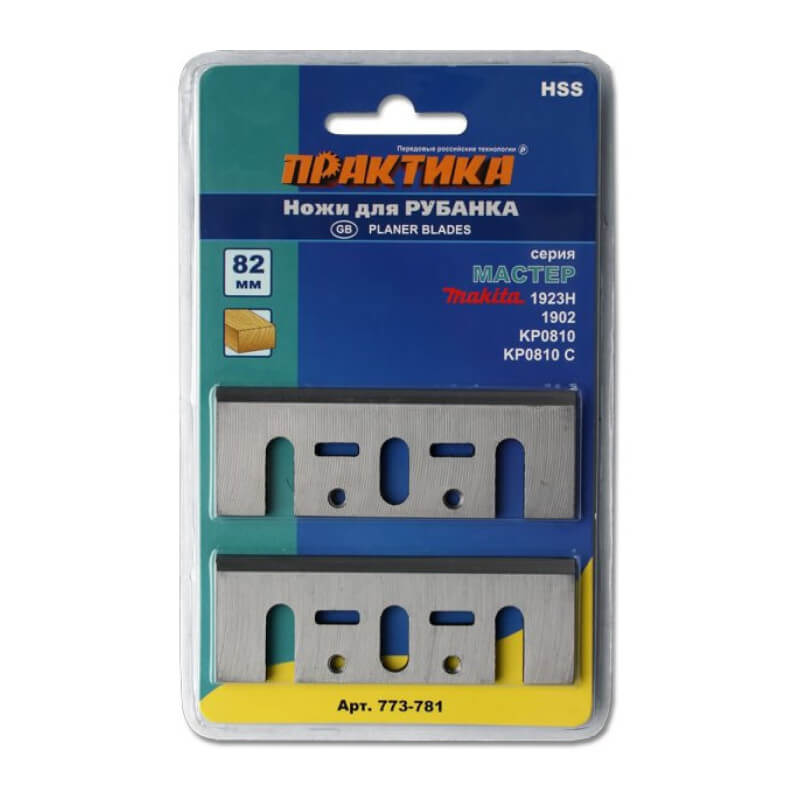 Нож для рубанка ПРАКТИКА 82 мм х 3 мм,быстрорежущая сталь, (2 шт ) 773-781 – сменная оснастка для электрических рубанков MAKITA 1923H/1902/KP0810. Предназначается для строгания заготовок из древесины.