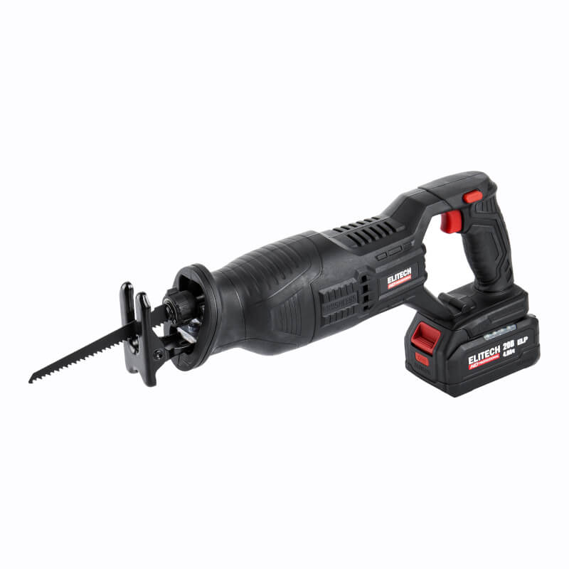 Пила сабельная ELITECH SSC 2028BL аккумуляторная (E2206.027.01) подходит для резки строительных и отделочных материалов — черных и цветных металлов, дерева и производных материалов на его основе (фанера, ДСП, OSB, МДФ и подобные), различных видов пластика, кирпича, газо- и пенобетона, в том числе комбинаций этих материалов. Пила работает от литий-ионного аккумулятора 20 В емкостью 4,0 А/ч.