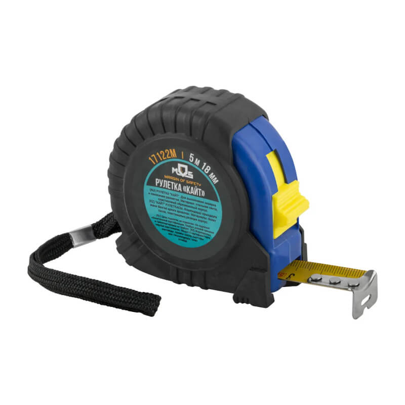 Рулетка MOS «Кайт» 5м х 18 мм используется при строительных и ремонтных работах для проведения линейных замеров. Рулетка заключена в ударопрочный пластиковый корпус, имеющий прорезиненные вставки. Такое покрытие защищает инструмент при ударах и падениях, а также препятствует скольжению в руке. Стальная измерительная лента имеет длину 5 м, ширина составляет 18 мм.