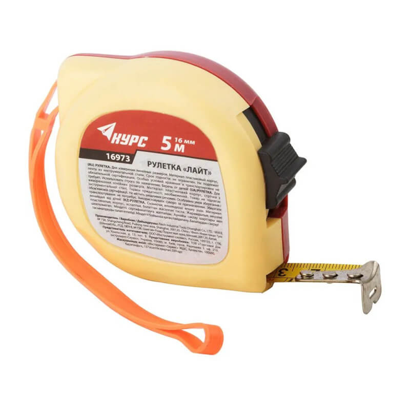 Рулетка пластиковая 2-х цветная «Лайт» 5 м x 12,5 мм КУРС FIT используется для замеров и разметки при строительных и ремонтных работах, а также в быту. Двухцветный ударопрочный корпус произведен из ABS пластика, стальная измерительная 5-метровая лента имеет защитное нейлоновое покрытие.