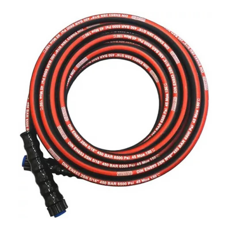 Шланг высокого давления, гайка-гайка, двухоплеточный, 2SN-06, 450 бар, 10 м благодаря двухоплеточной конструкции способен выдерживать давление до 450 бар, что позволяет эффективно очищать самые загрязненные поверхности. Шланг имеет длину 10 метров, что обеспечивает удобство работы и позволяет оператору свободно перемещаться во время уборки.