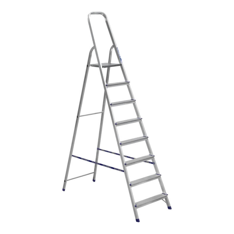 Стремянка алюминиевая 8ст. Фиксируется в рабочем положении при помощи рабочей площадки, выполненной из оцинкованной стали. Ступени имеют рифленую противоскользящую поверхность, что способствует безопасному подъему и спуску. Прочное крепление ступеней к боковинам 4-мя заклепками придает конструкции высокую устойчивость.