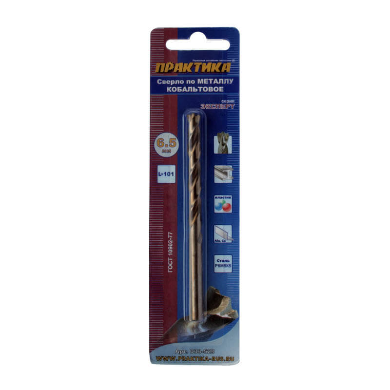 Сверло по металлу кобальтовое ПРАКТИКА 6,5 х 101 мм блистер изготовлено из быстрорежущей стали легированной кобальтом Р6М5К5. Сверло полностью шлифованное. Идеально точное засверливание без предварительного накернивания возможно благодаря специальной W-образной заточке с подрезающими кромками. Угол заточки составляет 135 градусов. При работе с данной оснасткой рекомендуется использование СОЖ.
