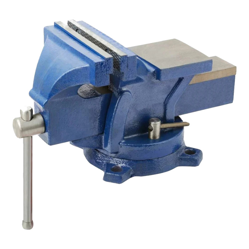 Поворотные станочные тиски с шириной губок 125 мм и весом 6,5 кг фиксируют различные заготовки для последующей обработки. Поворотный шарнирный механизм позволяет зафиксировать необходимый для работы угол. Для прижима деталей есть винтовой механизм. Тиски выполнены из высококачественного чугуна. Благодаря покрытию порошковой краской ударостойкие тиски приобретают сопротивление истиранию и коррозии.